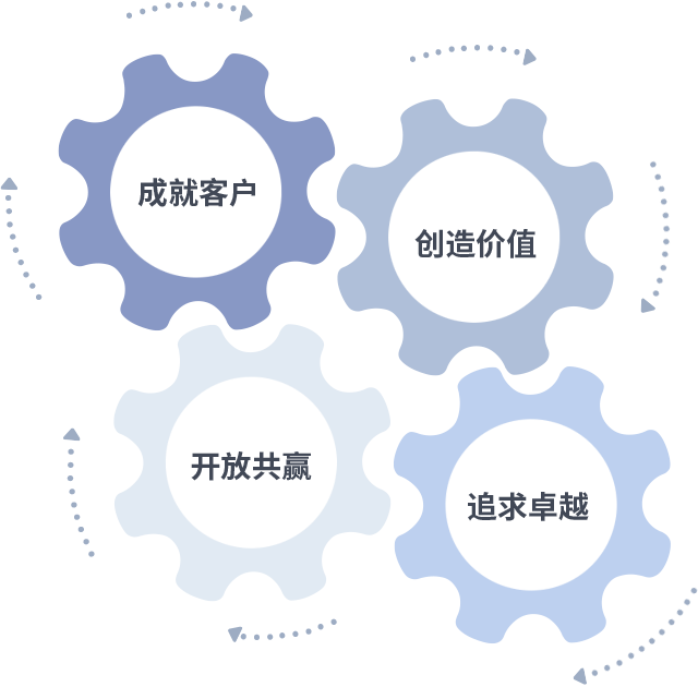 成就客户是一切决策的出发点,,,,创造价值是衡量所有工作的标准,,,追求卓越是我们做事做人的态度,,,,开放共赢是我们的格局也是最终的结果。。价值观的齿轮环环相扣,,推动着组织里的每个人不断向前。。